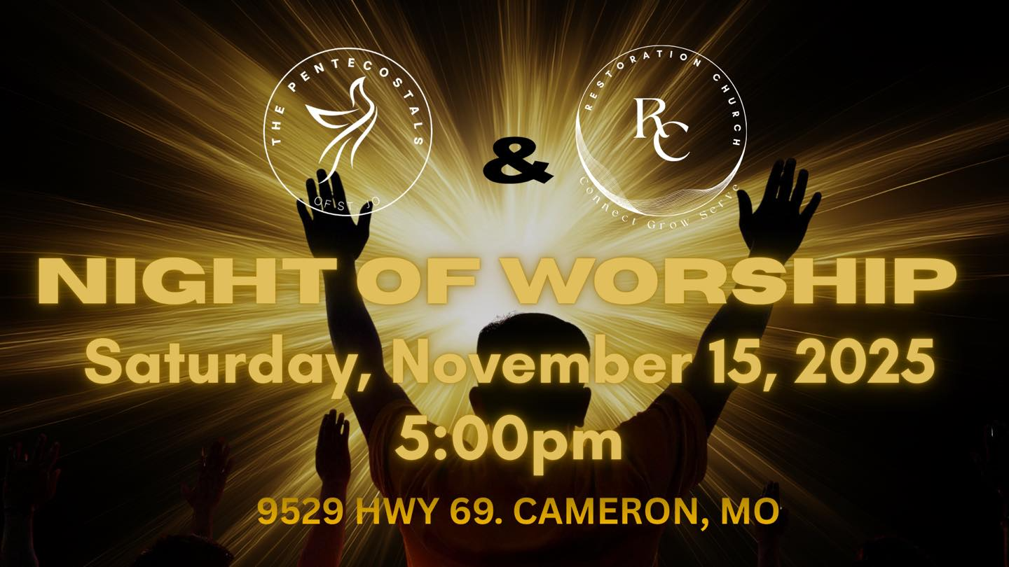 Restoration Church 9529 US - 69, Cameron, Missouri, United StatesJoin us for a powerful Night of Worship hosted by The Pentecostals of St. Joseph together with Restoration Church. We’re coming with one heart and one purpose to lift up the name of Jesus and make room for His presence. If you’re hungry for a fresh touch from God, if you need renewal in your...